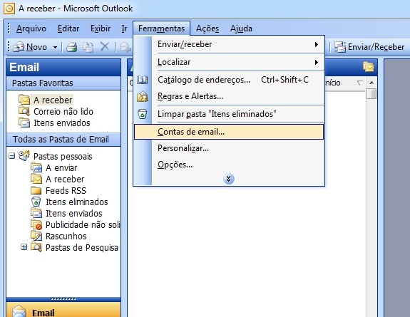 | Para configurar uma nova conta de correio electrónico clique em Ferramentas e selecione Contas de Email como na imagem seguinte: |