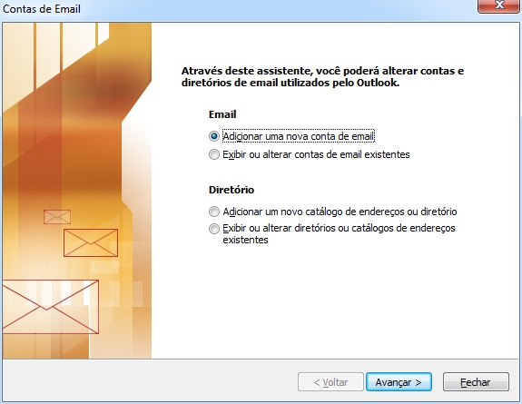 Irá aparecer o assitente de Contas de Email |