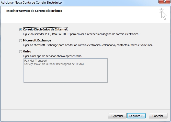 Irá aparecer novamente a janela para Escolher o Serviço de Correio Electrónico |